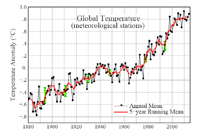Usually, looking at the time series of observed temperatures, we see graphs as the one below. These graphs show the temperature fluctuations over the past 150 years, where temperatures show a systematic increase. The length of the time series is a crucial feature for understanding temperature fluctuations, because temperatures show cycles that seem to persist for several decades: so, if we want to understand the amplitude of the climate fluctuations, the limited length of the time series may compromise our understanding of the phenomena.
